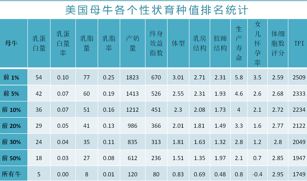 其次,你需要清楚地知道每一頭牛的生產(chǎn)性狀育種值(產(chǎn)奶量、乳蛋白量、乳脂量)、健康性狀育種值(生產(chǎn)壽命、女兒懷孕率、體細(xì)胞數(shù)評(píng)分)以及體型性狀育種值(體型、乳房結(jié)構(gòu)、肢蹄結(jié)構(gòu))。下表為美國(guó)荷斯坦協(xié)會(huì)在2018年4月公布的美國(guó)牛群各性狀的育種值。你了解到你的牛群存在的差距了嗎?