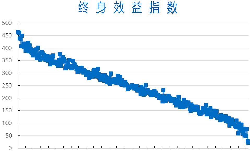 上圖中橫坐標(biāo)為月齡,縱坐標(biāo)為遺傳效益指數(shù),每個(gè)點(diǎn)代表一頭牛,不同顏色代表不同胎次牛。