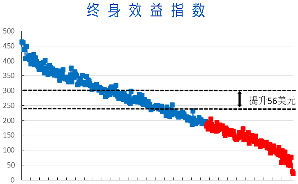 如下圖,將遺傳品質(zhì)最差的100頭犢牛出售以后,剩下的犢牛平均終身效益指數(shù)能夠提升56美元,達(dá)到300美元,每頭牛將來(lái)能夠?yàn)槟翀?chǎng)賺的錢更多。